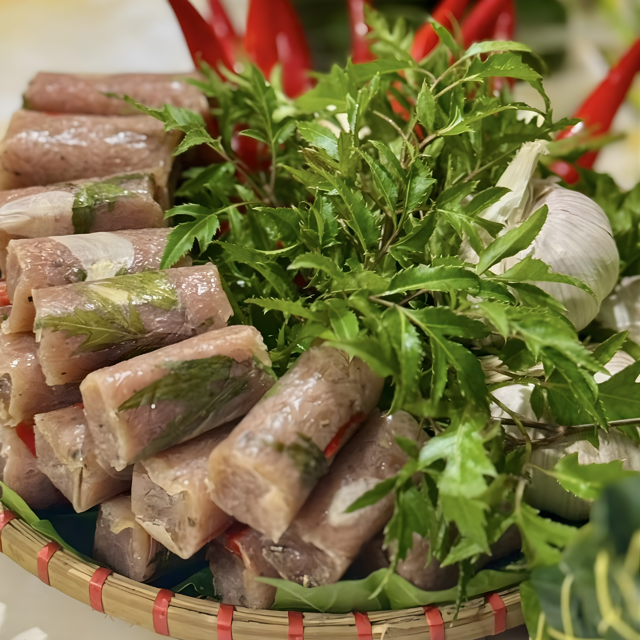Thành phần: Thịt heo, bì heo, cùng một số gia vị truyền thống (ớt, tỏi,...).