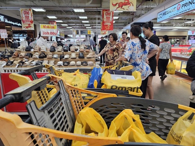 Ghi nhận của phóng viên Báo Người Lao Động cho thấy lượng khách đổ về các siêu thị, trung tâm thương mại tăng mạnh, đặc biệt ở các gian hàng kinh doanh bánh kẹo, mứt Tết, thực phẩm tươi sống và đông lạnh, rau củ, thịt, hoa tươi, quần áo, giày dép và đồ gia dụng. Đây là những nhóm hàng được người tiêu dùng chi tiêu nhiều nhất để chuẩn bị cho một cái Tết đủ đầy.