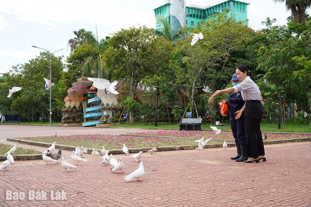 Chị Võ Thị Tư, công nhân Công ty Cổ phần Môi trường đô thị Phú Yên, người phụ trách chăm sóc những chú chim bồ câu, cho biết: Đây là giống bồ câu ta nên thân mình nhỏ, nhanh nhẹn và dễ thích ứng với môi trường tự nhiên trong đô thị. Một ngày chim được cho ăn 3 lần, nước uống và chuồng cũng được thay và dọn dẹp thường xuyên. Để thuần hóa, ban đầu, việc cho chim ăn do một công nhân chuyên phụ trách và chúng cũng chỉ sà xuống ăn khi nghe thấy tiếng gọi quen thuộc. Dần dần, người dân cho ăn cùng nên chim cũng dạn người hơn. Hiện giờ, du khách có thể chụp ảnh, giao lưu tự nhiên với chúng.
