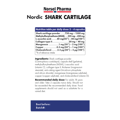 - Nordic Shark Cartilage (Dưỡng chất sụn cá mập Bắc Âu) là dưỡng chất bảo vệ sức khỏe được phát triển và sản xuất tại Na Uy, theo tiêu chuẩn Na Uy, và được chứng nhận từ Châu Âu và Hoa Kỳ