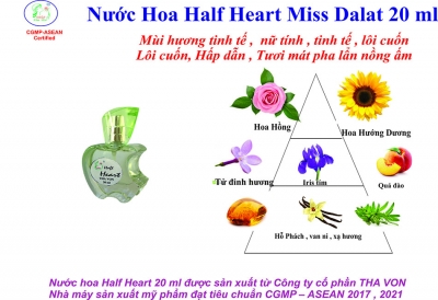 Nước hoa Half Heart Miss Dalat 20 ml được sản xuất từ Công ty cổ phần THA VON, nhà máy sản xuất mỹ phẩm đạt tiêu chuẩn CGMP – ASEAN .