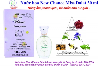 Nước hoa New Chance Miss Dalat 30 ml . Hương Hoa , gia vị , gỗ . phong cách thanh lịch , lôi cuốn cho nữ giới .