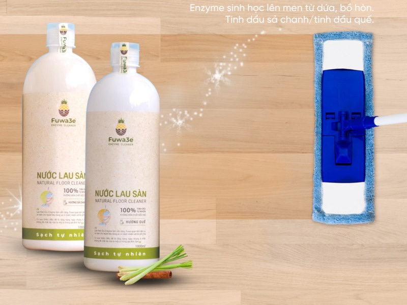 - Nước Lau Sàn FUWA3E chứa Enzyme sinh học từ dứa và bồ hòn, giúp loại bỏ dầu mỡ, kháng khuẩn và ngăn nấm mốc phát triển.