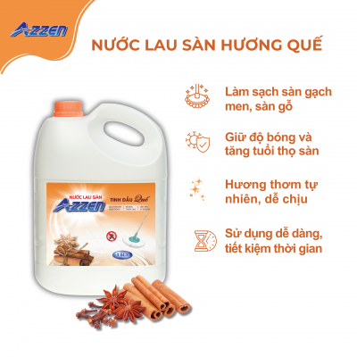 Nước lau sàn Azzen giúp làm sạch bóng sàn nhà, làm sạch vết bản bám lâu trên nền nhà,. Không chỉ có công dụng làm sạch sàn nhà, với hương thơm từ thảo mộc giúp diệt vi khuẩn, đuổi muỗi và các loại côn trùng bảo vệ sức khỏe cho cả gia đình sẽ tạo bầu không khí dễ chịu, thơm mát, tạo cảm giác thư thái cho không gian ngôi nhà bạn.