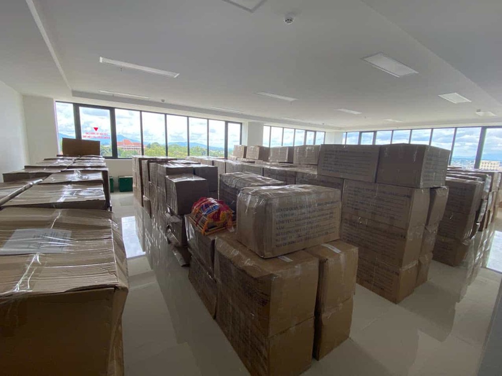 Tại tầng 9 của tòa nhà, nhân viên đang vận chuyển hàng trăm thùng hồ sơ, giấy tờ, tài liệu từ trụ sở các phường, xã cũ về lưu trữ.