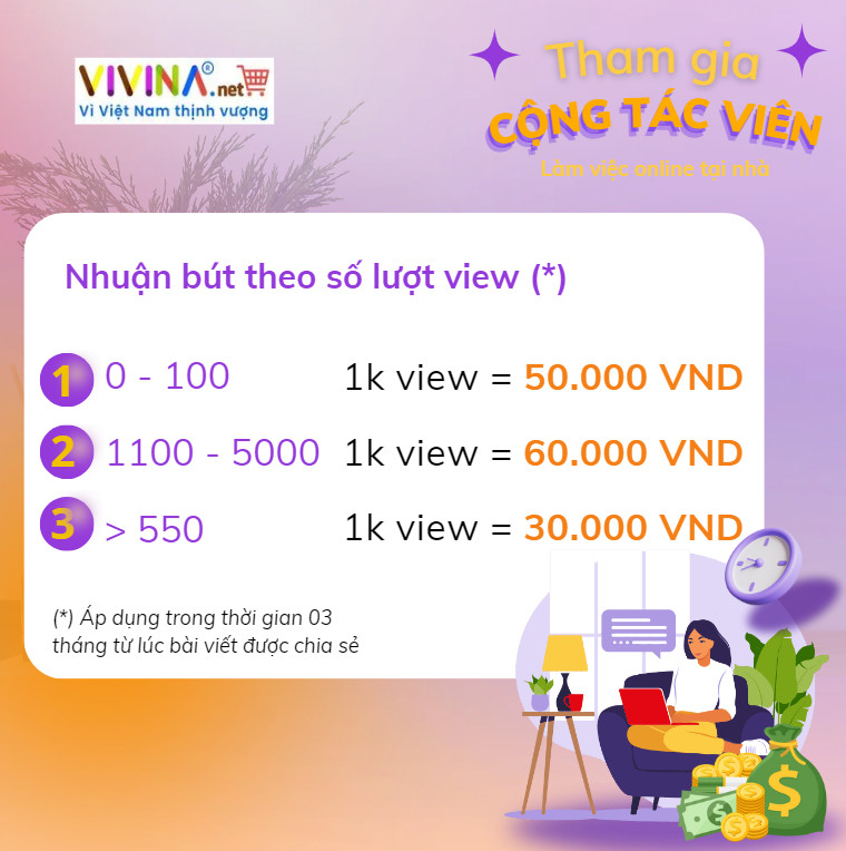 - Nhuận bút theo số lượt view: Áp dụng trong thời gian 03 tháng từ lúc bài viết được chia sẻ. Mỗi bài viết khi được chọn đăng trên VIVINA do người viết hoặc thành viên bất kỳ trên VIVINA sử dụng để chia sẻ trên mạng xã hội (Facebook, Zalo,...) sẽ có giá view dựa trên công thức sau: