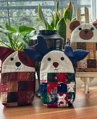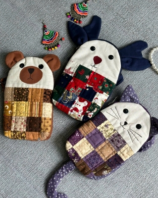 Từng chiếc túi thú được may thủ công hoàn toàn bằng tay, kết hợp kỹ thuật ghép vải patchwork tinh tế, tạo nên những mẫu túi độc đáo, không chiếc nào giống chiếc nào.