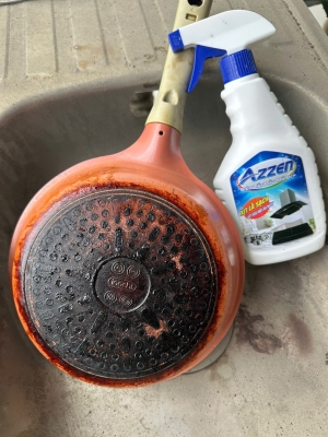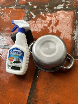 Làm nóng già vật dụng (đáy xoong nồi), xịt đều dung dịch lên bề mặt vết bẩn, chà nhanh tay lúc đang còn nóng. Nếu vết bẩn bám chắc. Lặp lại 1-2 lần cho đến khi sạch vết bẩn.