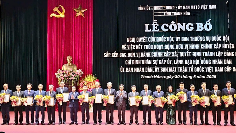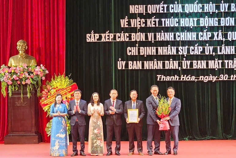 Sáng 30/6, tỉnh Thanh Hóa tổ chức Lễ công bố Nghị quyết của Quốc hội, Ủy ban Thường vụ Quốc hội về việc sắp xếp các đơn vị hành chính cấp xã; Quyết định thành lập Đảng bộ cấp xã; Chỉ định nhân sự cấp ủy, Hội đồng nhân dân, Ủy ban nhân dân, Ủy ban Mặt trận Tổ quốc Việt Nam cấp xã.