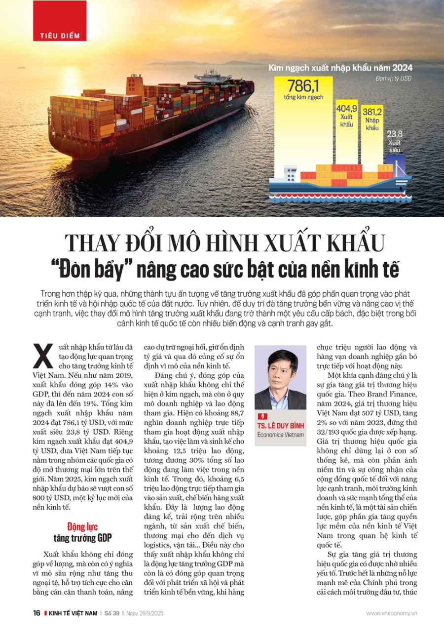 Để khắc phục những hạn chế này, cần có tư duy mới từ cơ quan quản lý đến doanh nghiệp. Chiến lược xuất nhập khẩu cần ưu tiên gia tăng giá trị nội địa trong xuất khẩu, phát triển công nghiệp hỗ trợ và chuỗi cung ứng trong nước. Doanh nghiệp Việt Nam cần đóng vai trò tiên phong trong thay đổi mô hình tăng trưởng xuất khẩu, chú trọng phát triển thương hiệu sản phẩm và đầu tư mạnh vào đổi mới công nghệ. Chỉ khi đó, xuất khẩu mới thực sự trở thành động lực tăng trưởng bền vững, đóng góp vào mục tiêu nâng cao vị thế quốc gia và hội nhập quốc tế sâu rộng...