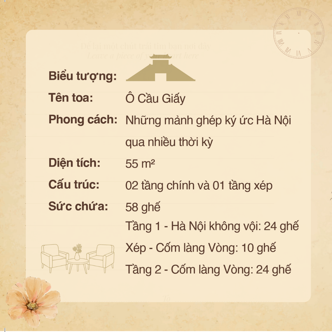 Ô Cầu Giấy được kiến tạo như một bức tranh ghép nghệ thuật, nơi dòng chảy của lịch sử và kiến trúc Hà Nội hòa quyện vào nhau. Không gian tái hiện những nét đặc trưng của một đô thị ngàn năm văn hiến, từ tường nhà cổ rêu phong đến vách ngăn không gian bằng mây tre; từ những viên gạch bông hoa văn tinh xảo đến đường ray chở trên đó biết bao hành trình.