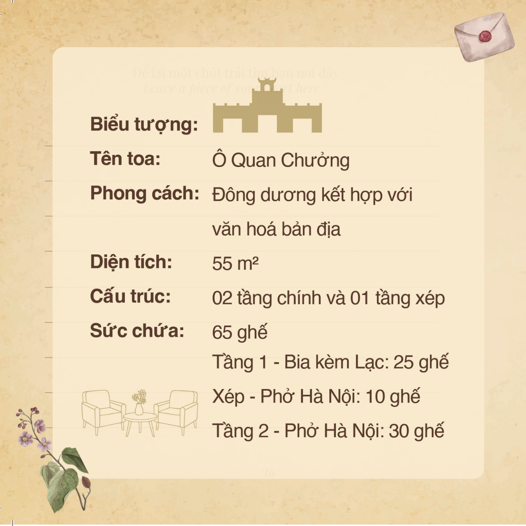 Ô Quan Chưởng được kiến tạo như một bảo tàng ký ức di động, nơi dòng chảy lịch sử và nghệ thuật được lồng ghép qua từng lớp vật liệu và đường nét. Bước vào cửa ô này, bạn thấy mình như hiện diện trong một bức tranh giao thoa giữa sự kiên cố của di sản Đường sắt và vẻ lãng mạn của Kiến trúc Đông Dương – Pháp cổ, vốn là những mảnh ghép quý giá của Hà Nội.