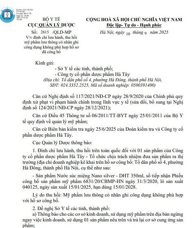 Cục Quản lý Dược (Bộ Y tế) vừa ban hành Công văn số 2615/QLD-MP ngày 10/9/2025 về việc đình chỉ lưu hành, thu hồi mỹ phẩm lưu thông có nhãn ghi công dụng không phù hợp hồ sơ đã công bố của Công ty Cổ phần Dược phẩm Hà Tây.