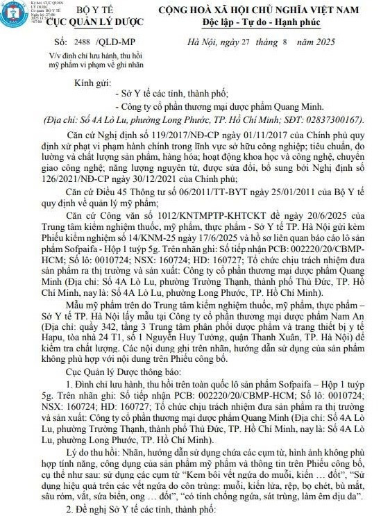 Ngày 27/8/2025, Cục Quản lý Dược (Bộ Y tế) đã ban hành Công văn số 2488/QLD-MP về việc đình chỉ lưu hành, thu hồi mỹ phẩm vi phạm về ghi nhãn của Công ty Cổ phần Thương mại Dược phẩm Quang Minh.