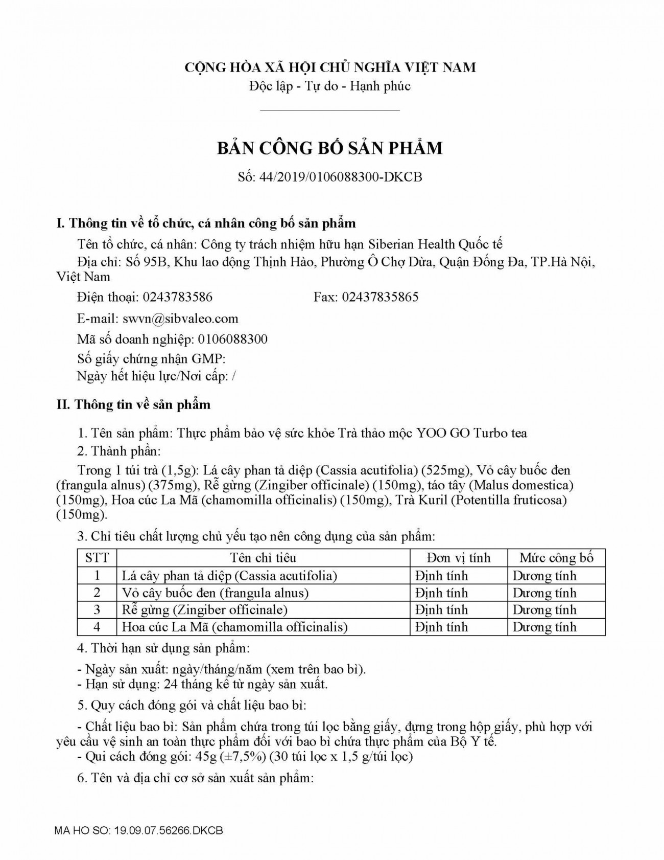 Trong 1 túi trà (1,5g): Lá cây phan tả diệp (Cassia acutifolia) (525mg), Vỏ cây buốc đen (frangula alnus) (375mg), Rễ gừng (Zingiber officinale) (150mg), táo tây (Malus domestica) (150mg), Hoa cúc La Mã (chamomilla officinalis) (150mg), Trà Kuril (Potentilla fruticosa)(150mg)