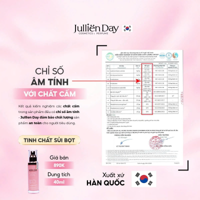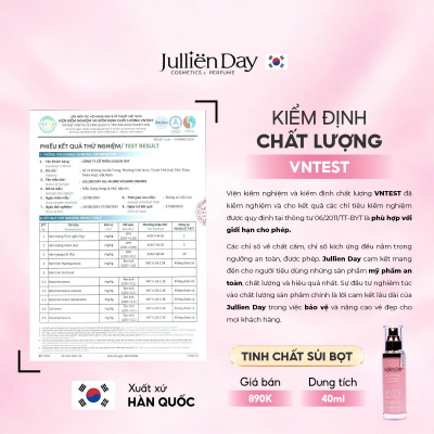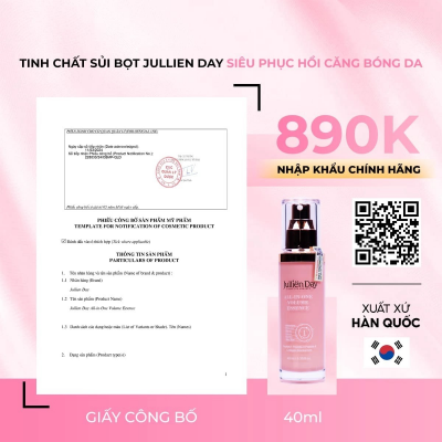 Sản phẩm Tinh chất tạo bọt siêu phục hồi căng bóng da Jullien day được nhập khẩu chính hãng từ Hàn Quốc, sản phẩm được kiểm nghiệm và được Bộ Y tế cấp phép.