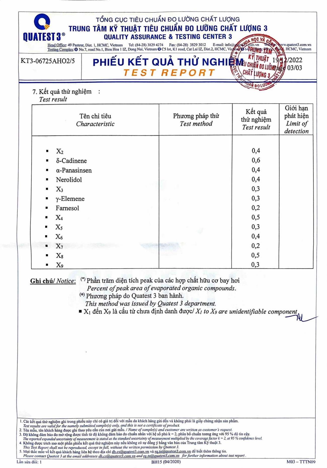+ Phương pháp chiết xuất: Chưng cất lôi cuốn hơi nước. Áp dụng công nghệ chiết xuất nhiệt độ thấp áp suất thấp hay còn gọi là công nghệ bảo toàn cấu tử tinh dầu trong quá trình chưng cất của Befine.