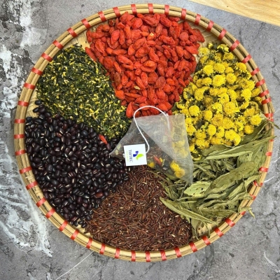 - Thành phần hoàn toàn tự nhiên: Gạo lứt huyết rồng, tâm sen, cúc hoa, kỳ tử, đỗ đen và các loại thảo mộc quý.