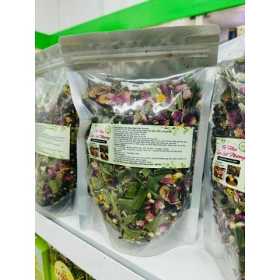 Gạo lứt nương - đỗ đen xanh lòng - gạo cẩm - cỏ ngọt - lá dứa - lá sen - hoa hồng - lá xạ đen - táo đỏ - hoa cúc (hoa lá thay đổi theo mùa)