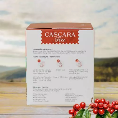 ** Thành phần: Cascara (vỏ quả cà phê), Dâu Tây, Cam úc, Táo Pháp, Hibiscus, Cỏ ngọt, Bạc hà