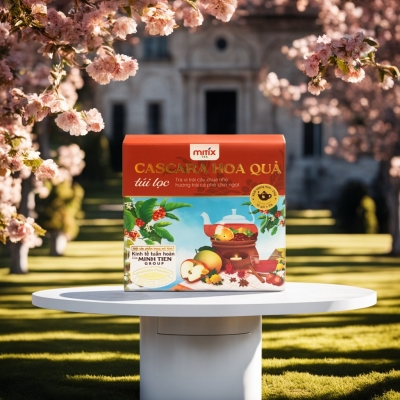 ** Thành phần: Cascara (vỏ quả cà phê), Dâu Tây, Cam úc, Táo Pháp, Hibiscus, Cỏ ngọt, Bạc hà, quế, hồi