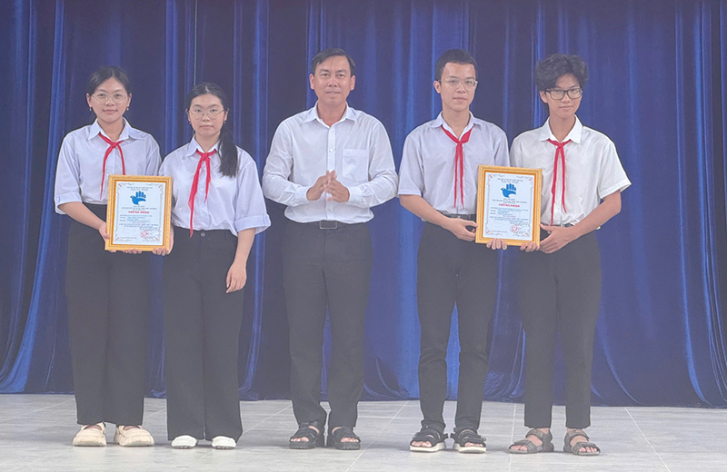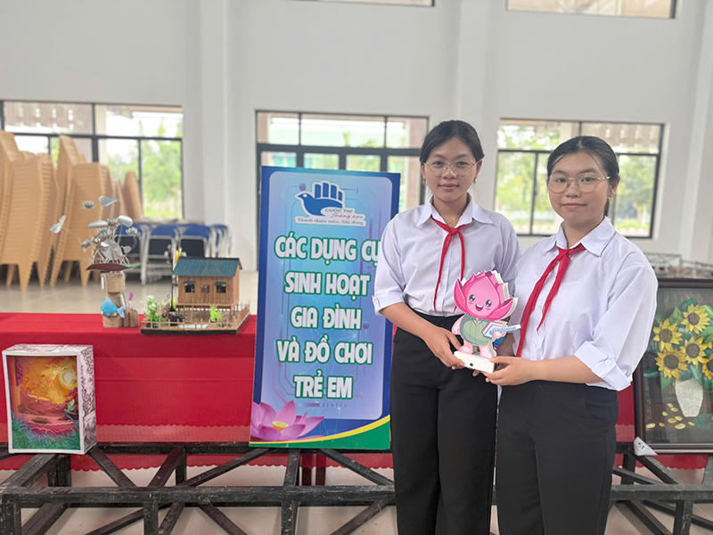 Nhóm tác giả Phan Nguyễn Phương Vi và Khưu Cát Tường - học sinh Trường THCS Long Khánh B, huyện Hồng Ngự với mô hình “Bé Sen thông minh - Cùng bé học và chơi” xuất sắc đạt giải Nhất tại Cuộc thi. Mô hình này được các em tạo ra không chỉ đơn thuần là một món đồ chơi công nghệ mà còn mang những mục đích sâu sắc, hướng đến việc giải quyết những vấn đề thiết thực trong thực tế và mang lại giá trị cho sự phát triển của trẻ em.