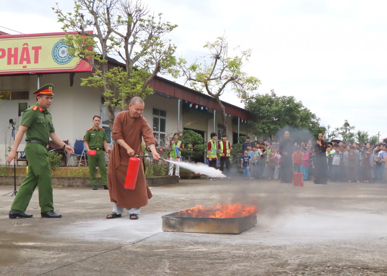 Sau khi được phổ biến kiến thức về PCCC, các sư thầy và các em được xem cán bộ, chiến sỹ Phòng Cảnh sát PCCC&CNCH thực hành kỹ năng nghiệp vụ về PCCC; trải nghiệm, thực hành kỹ năng chữa cháy khi dò rỉ khí gas; sử dụng bình chữa cháy xách tay bằng bột dập tắt đám cháy xăng dầu.