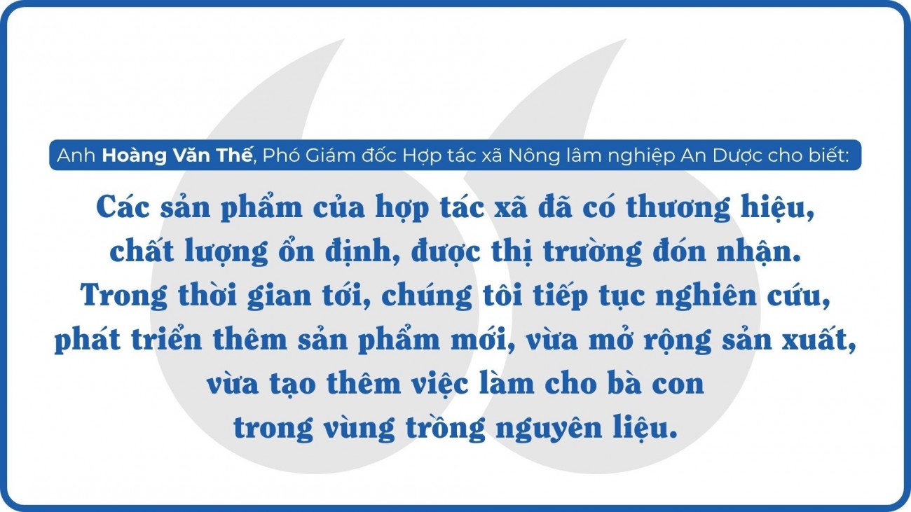 Cùng với việc nâng cao chất lượng sản phẩm, Hợp tác xã còn đặc biệt chú trọng xây dựng vùng nguyên liệu ổn định, hiện đơn vị liên kết với 20 hộ dân để trồng, thu hái và sơ chế nguyên liệu, từ đó tạo việc làm thường xuyên và tăng thu nhập cho hàng chục lao động nông thôn.