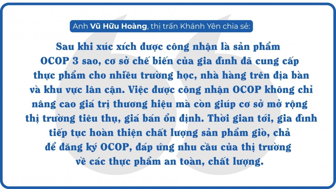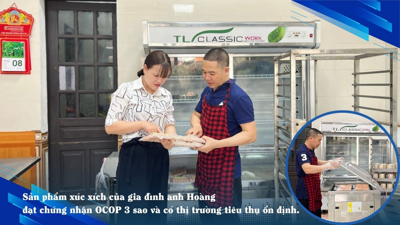 Không chỉ ở lĩnh vực dược liệu, chương trình OCOP tại Văn Bàn còn thành công trong ngành thực phẩm chế biến với sản phẩm xúc xích của gia đình anh Vũ Hữu Hoàng ở thị trấn Khánh Yên. Được biết, gia đình anh Hoàng có nhiều năm làm nghề chế biến giò, chả, xúc xích từ thịt lợn bản. Với bí quyết riêng, kết hợp công nghệ hiện đại và sự chỉn chu trong từng công đoạn sản xuất, cơ sở đã tạo ra các sản phẩm thơm ngon, an toàn và mang hương vị đặc trưng riêng.