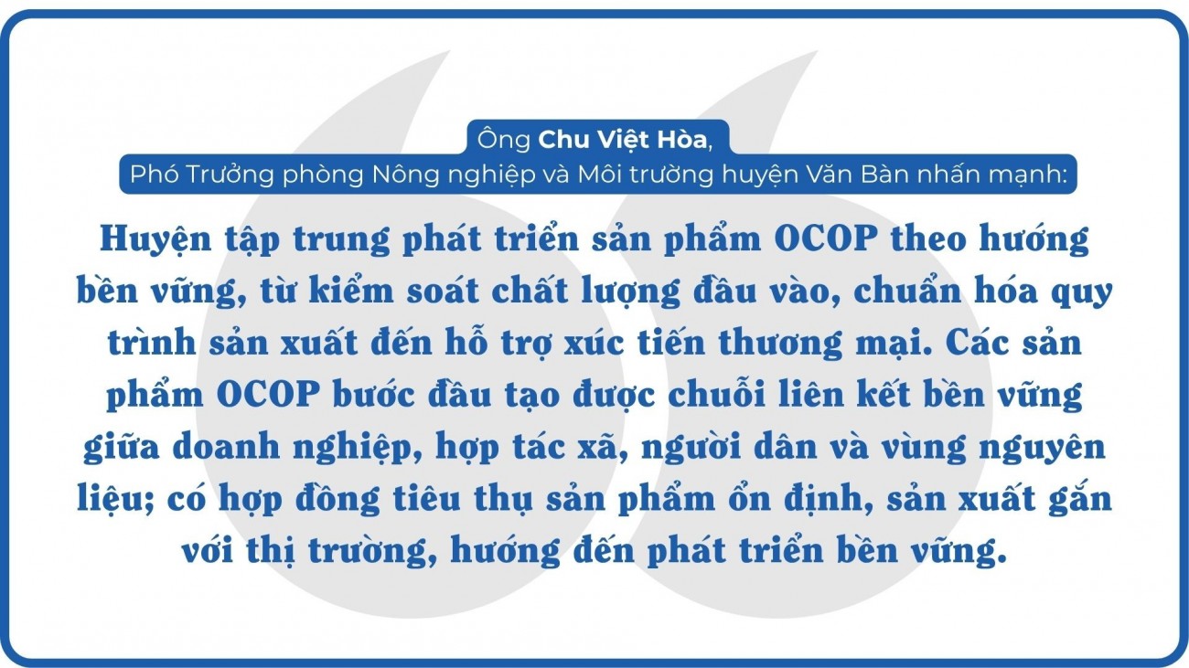 Tính đến nay, huyện Văn Bàn có 30 sản phẩm OCOP (còn thời hạn), các sản phẩm đều là đặc sản địa phương, mang đậm bản sắc vùng cao như: Măng sặt, tinh dầu thảo dược, trà thảo dược, bánh chưng đen, thịt sấy... Sau khi được xếp hạng OCOP, hầu hết sản phẩm đều được cải tiến mẫu mã, bao bì, dán tem truy xuất nguồn gốc, giúp nâng cao giá trị thương mại. Nhiều cơ sở sản xuất ghi nhận doanh thu tăng ít nhất 1,5 lần, tạo việc làm ổn định cho hàng chục lao động nông thôn.