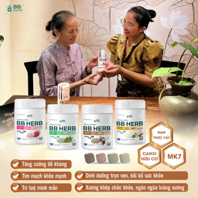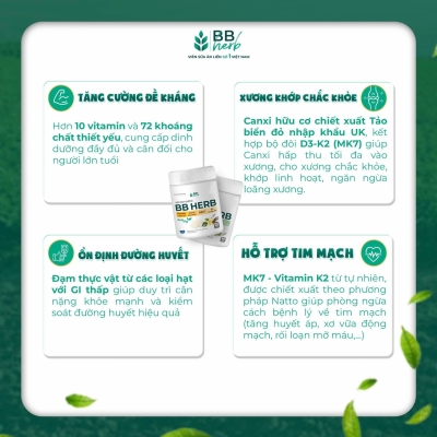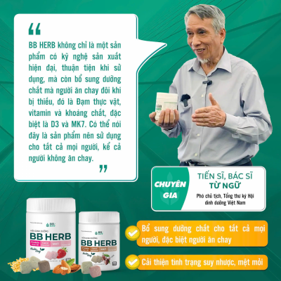 Viên sữa ăn liền BB HERB với thành phần thuần chay, 100% đạm thực vật từ các loại hạt cao cấp (Bắp, Macca, Óc chó, Gạo lức, Đậu đỏ, Yến mạch), bổ sung hoạt chất MK7, Canxi hữu cơ, D3 cùng 10 vitamin và 72 khoáng chất thiết yếu, là lựa chọn hàng đầu giúp bổ sung dinh dưỡng cân đối, đủ chất và lượng cho cả gia đình.