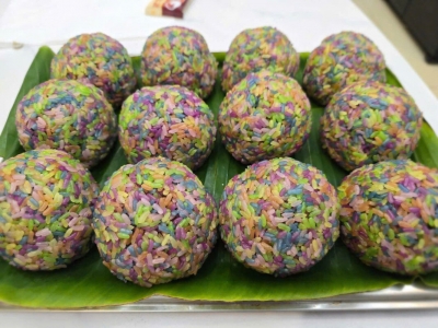 Bọc nhân đỗ xanh – thịt bằng bột khúc màu, lăn qua nếp đã ngâm theo màu tương ứng.