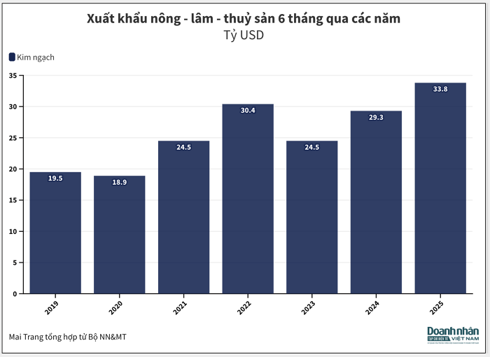 Bộ Nông nghiệp và Môi trường cho biết 6 tháng năm 2025, tổng giá trị xuất khẩu nông, lâm, thủy sản ước đạt 33,8 tỷ USD, tăng 15,5% so với cùng kỳ năm 2024.